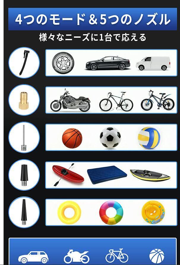 ★【全バルブ対応】5種類のノズル付き、すべての自転車、自動車、バイクに対応しています。スポーツボール、浮き輪などにも対応可能です。